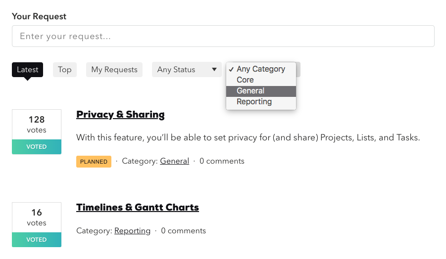 In the Pro version of Simple Feature Requests, you can add categories for your requests. This is a great way to keep the requests organized, and to enhance the filtering for your users.