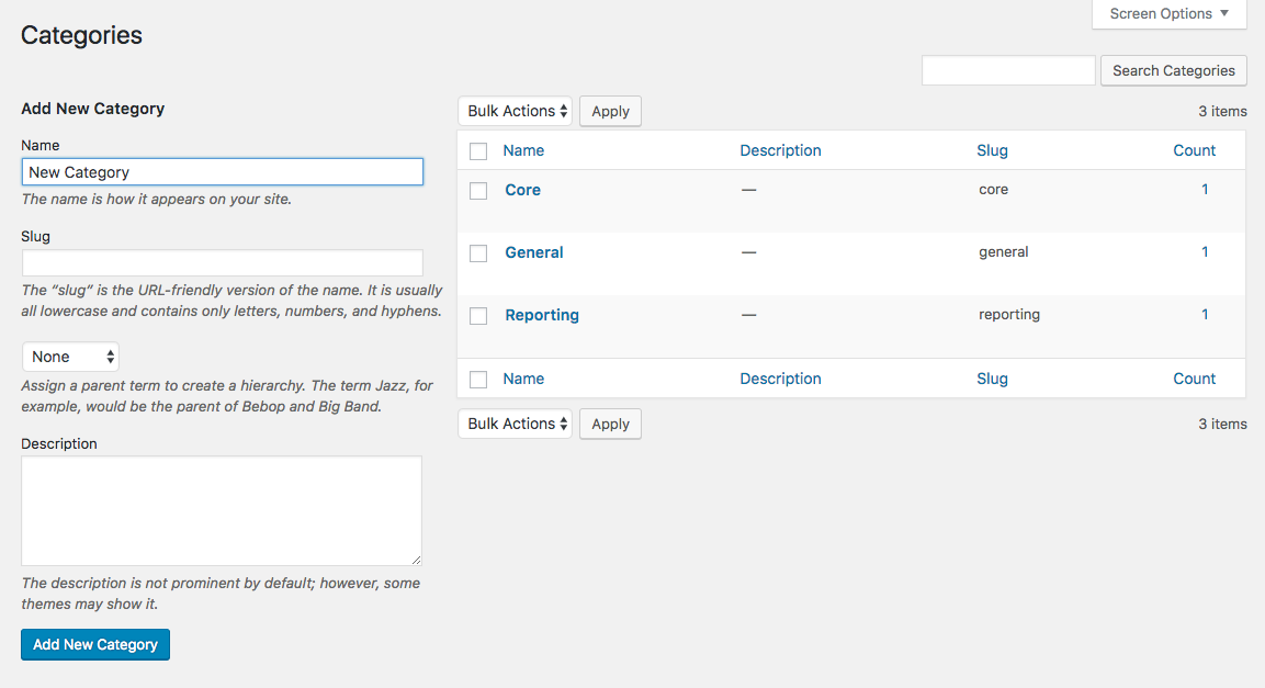 These can be added in the same way as post categories. Enter the Name of your category into the form and click Add New Category.