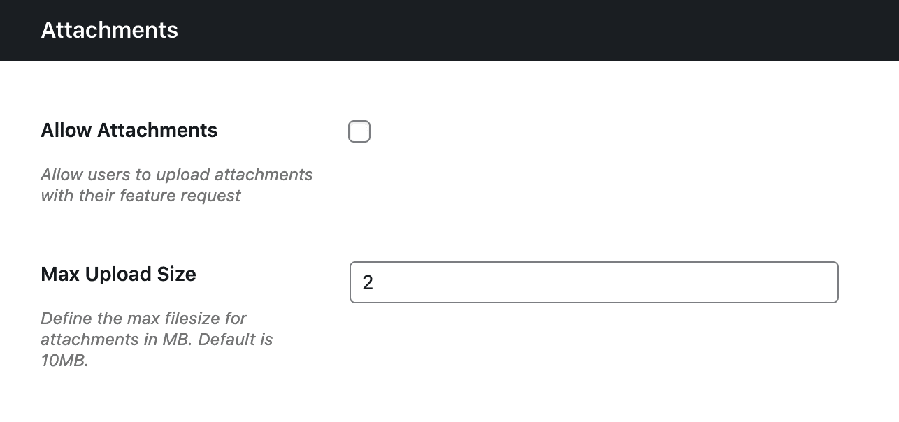 Here, you can enable or disable image uploads. Note that if you disable image uploads after some images have been uploaded, they will no longer be displayed on the associated feature requests.