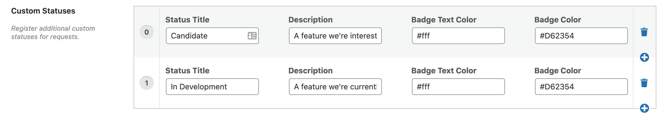 Each status requires a status title, description, badge text color, and badge color. The Badge Text Color and Badge Color fields accept any valid HTML color value.